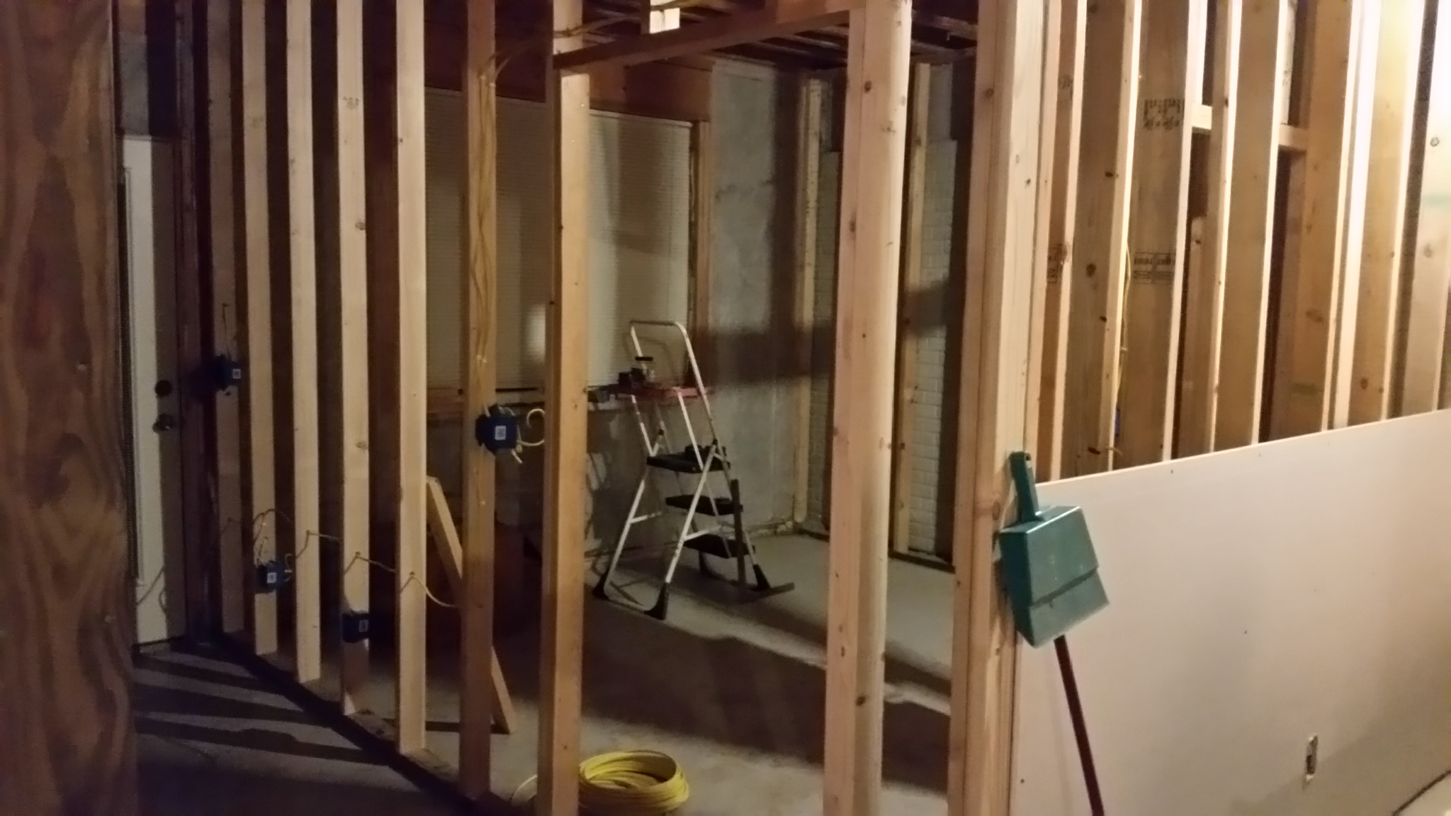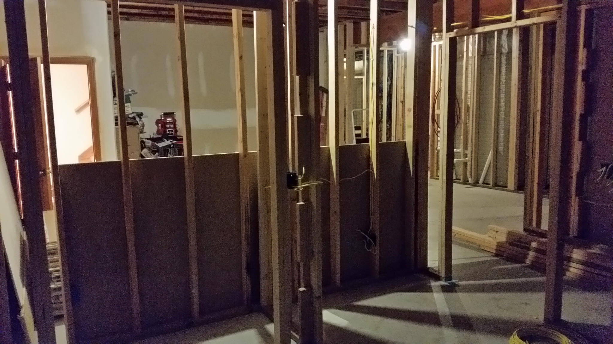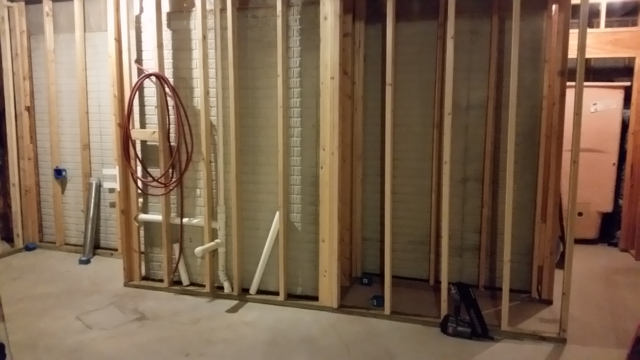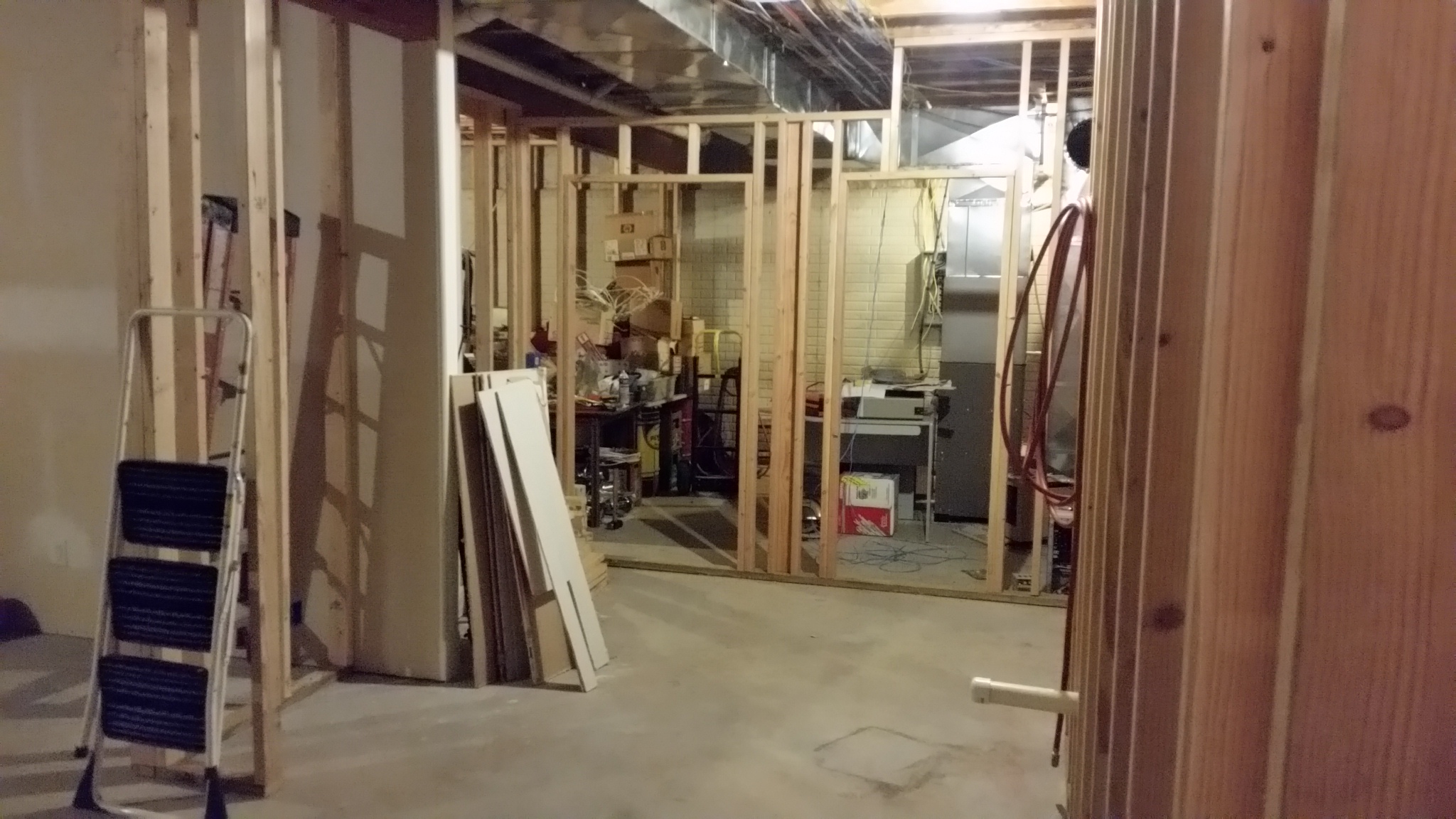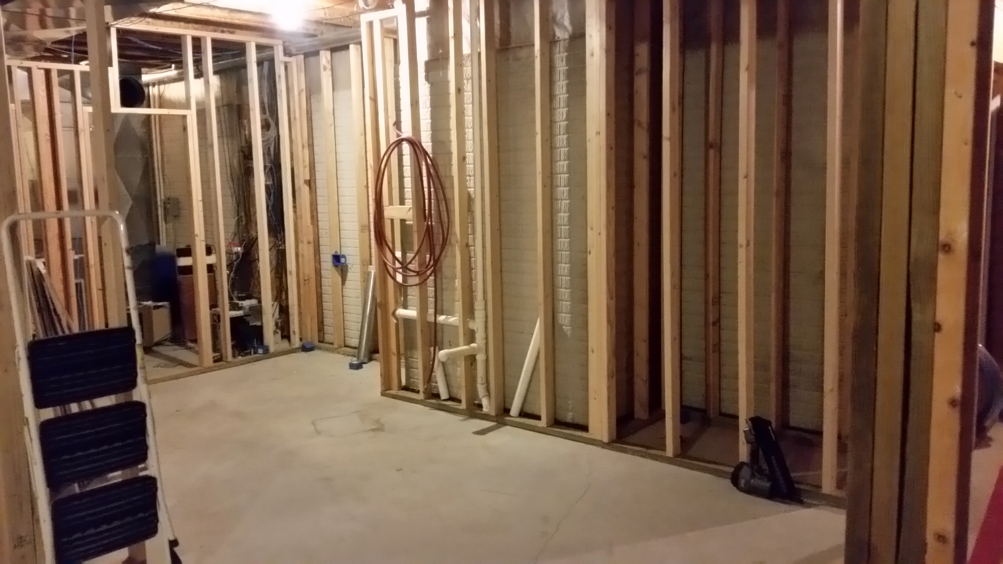 These pictures of the basement were taken Sunday night 09-13-2015: This weekend, most of the remaining framing was completed, and a good start on the wiring and plumbing was begun.