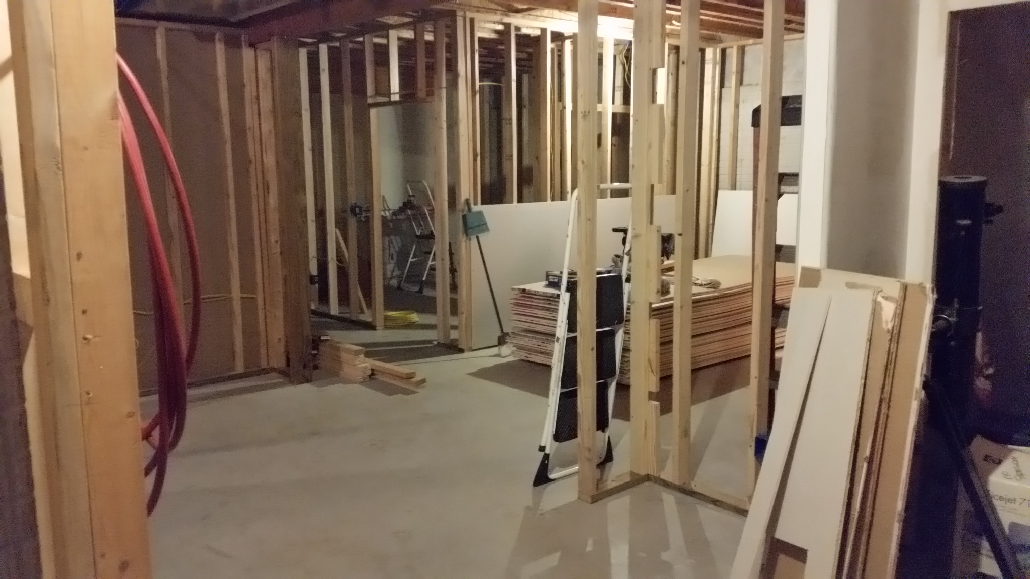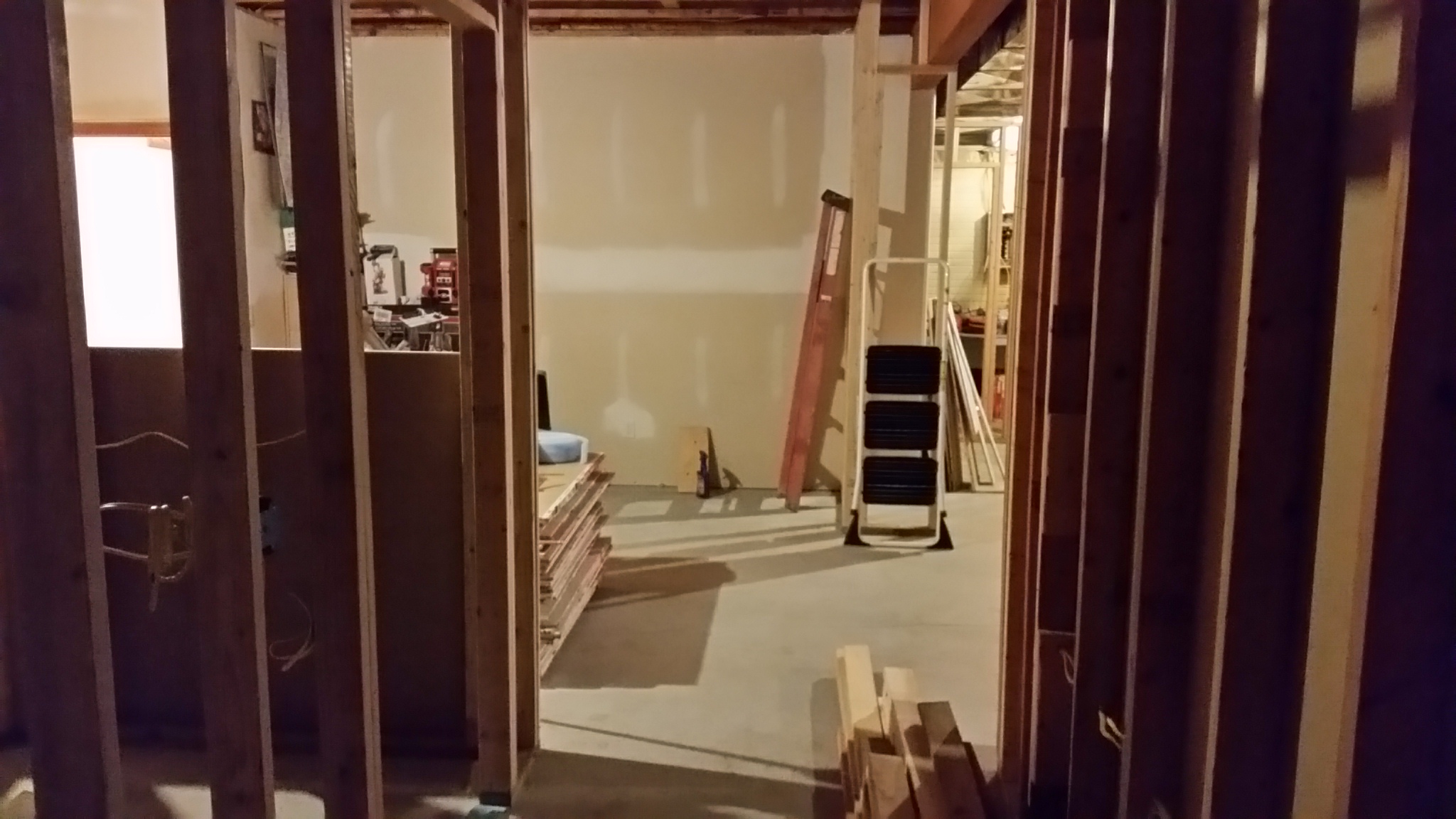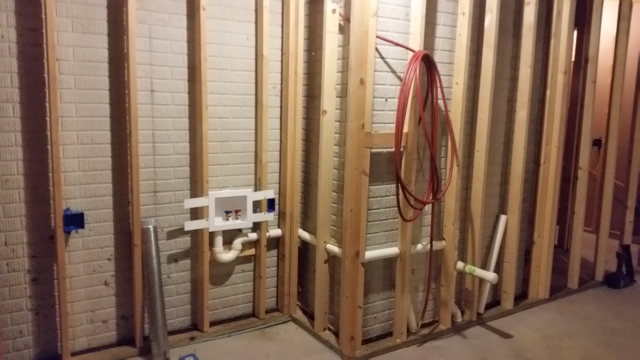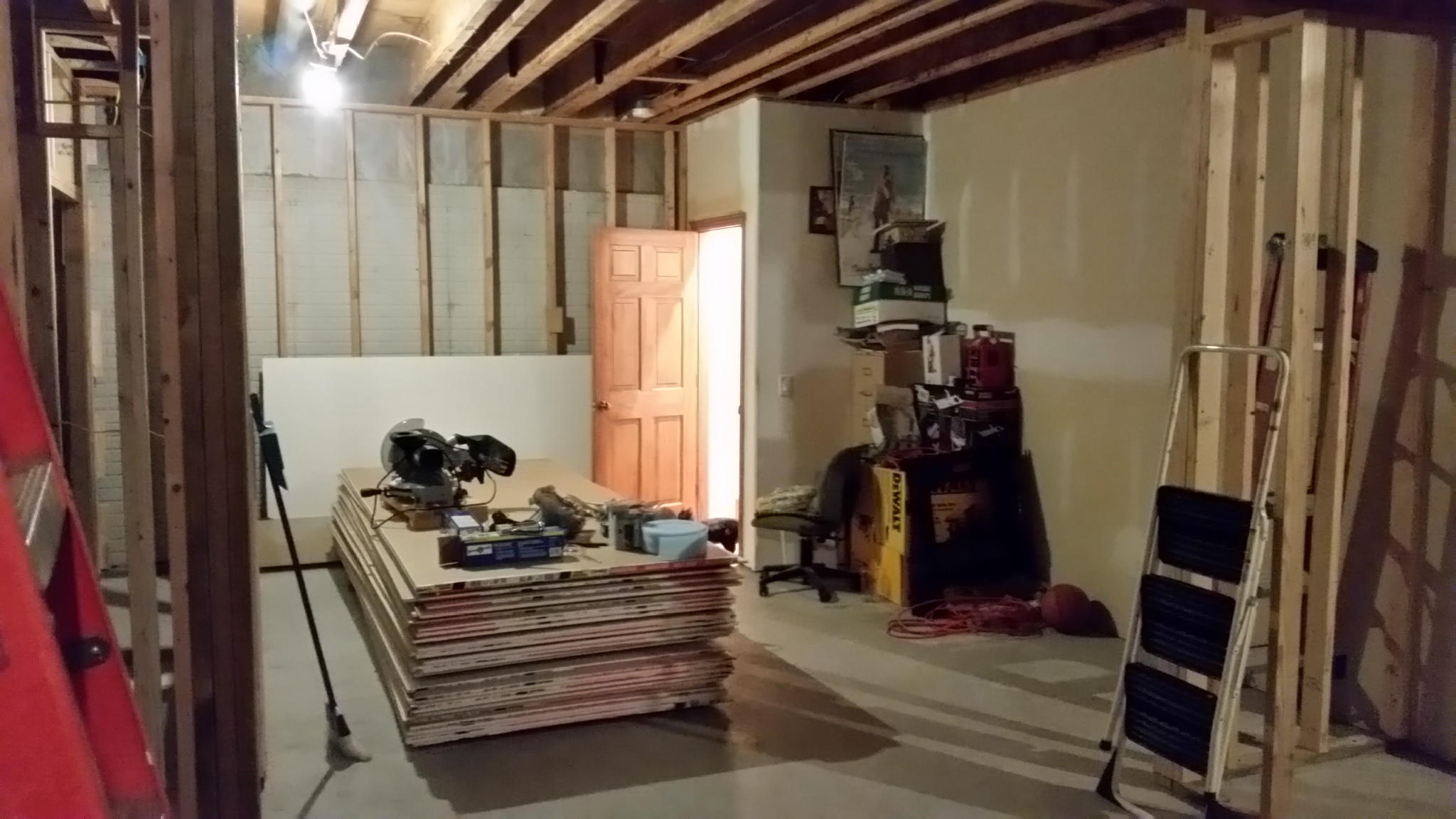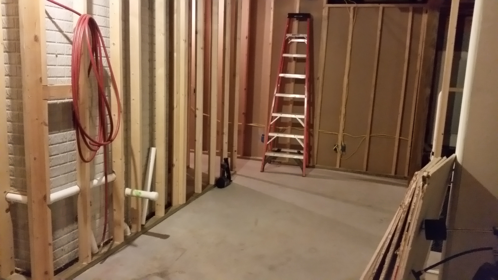 These pictures of the basement were taken Sunday night 09-13-2015: This weekend, most of the remaining framing was completed, and a good start on the wiring and plumbing was begun.